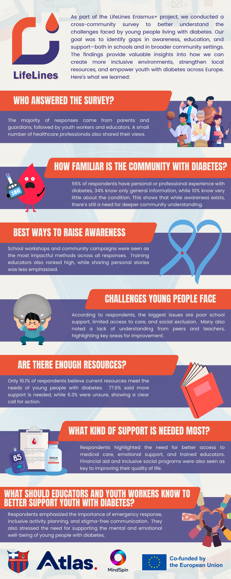 As part of the LifeLines Erasmus+ project, we conducted a cross-community survey to better understand the challenges faced by young people living with diabetes. Our goal was to identify gaps in awareness, education, and support—both in schools and in broader community settings. The findings provide valuable insights into how we can create more inclusive environments, strengthen local resources, and empower youth with diabetes across Europe.